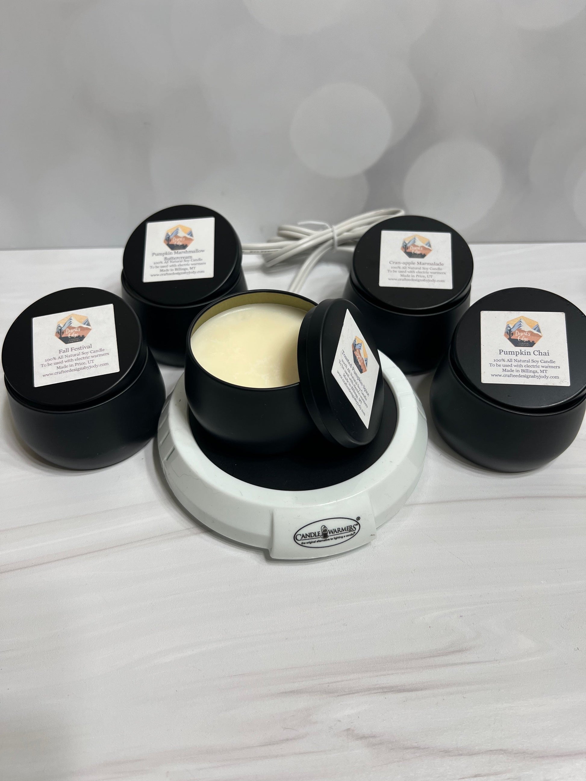 In this package you will receive four of our 4 oz scented candle tins plus a warming plate. This is a favored wickless/flameless option for school teachers, office workers, and families with small children.