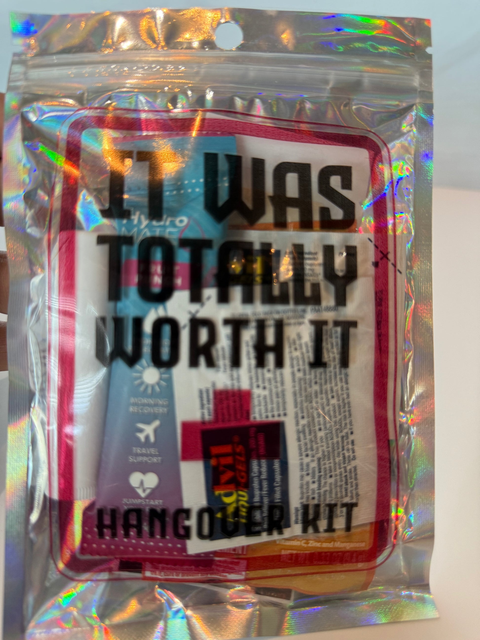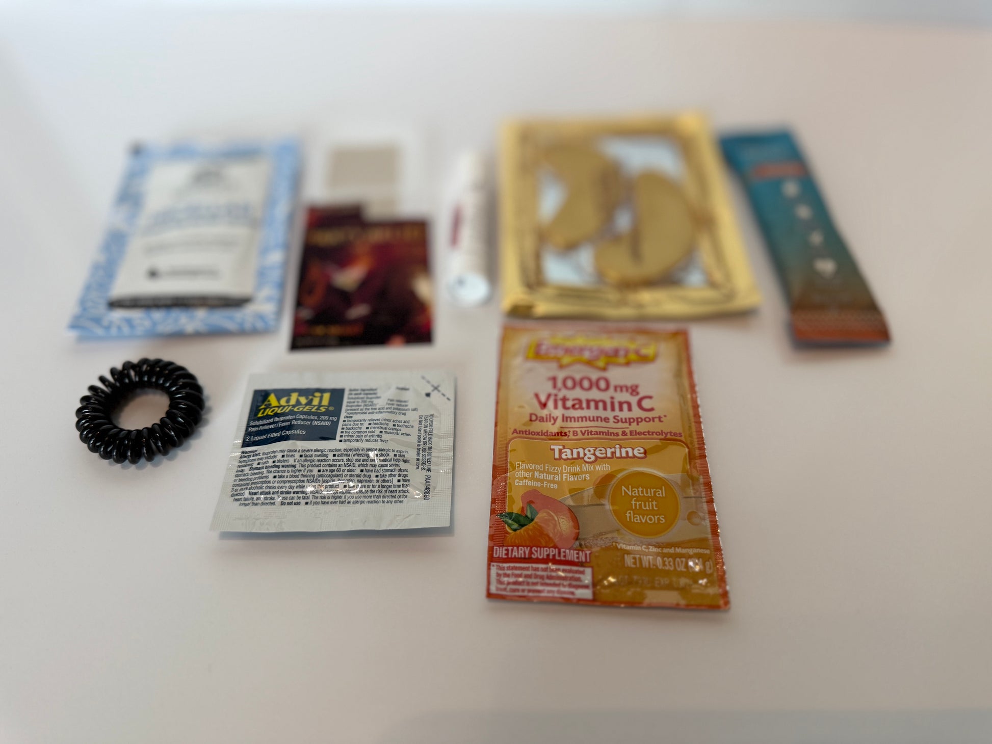 Kits contain: 2 hangover patches, micellar wipe, InstantIV powder, chapstick, hair tie, 2 Advil, eye masks, Vitamin C powder and Mentos breath mints.