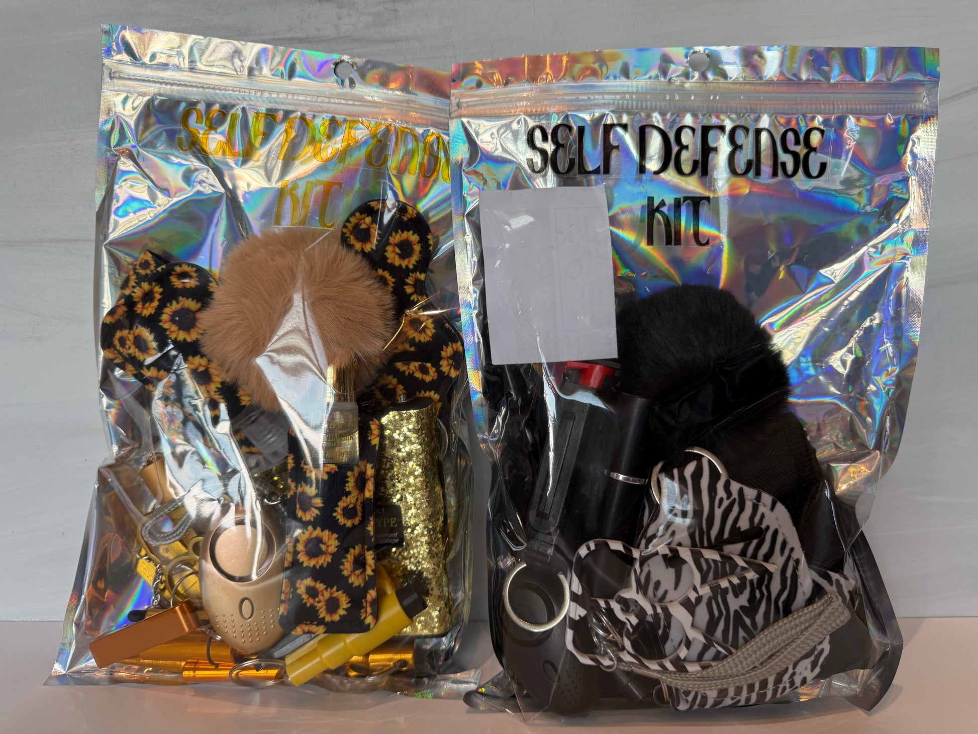 All kits will include the following: mini suitcase, batons, key knife, seat belt cutter/window breaker, kitty knuckles, taser, pepper spray, lanyard or decorative keychain, no-touch keychain, whistle, personal alarm and poof ball key chain. Kits will come with bonus items depending on what we have in stock at time of order.
